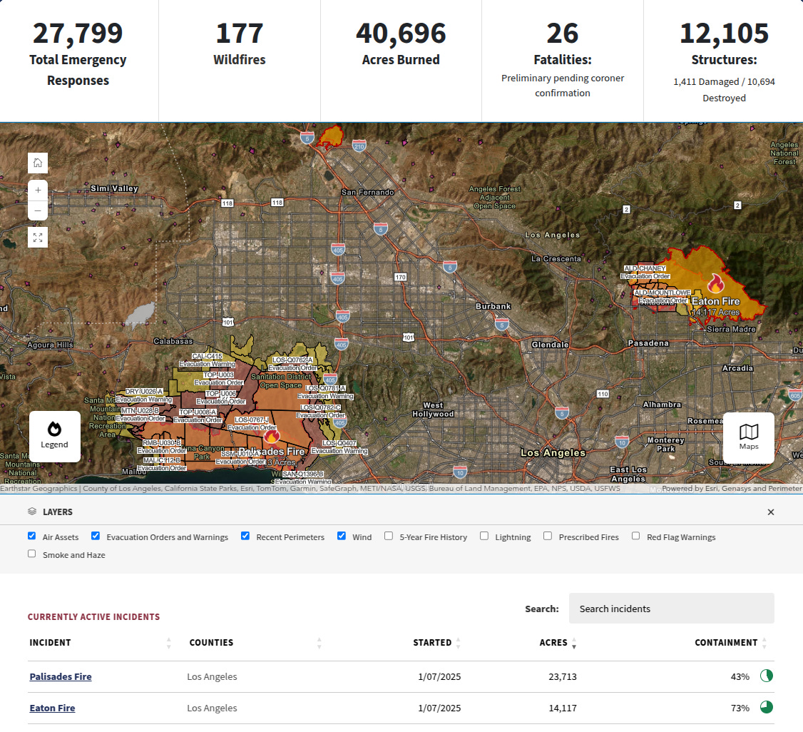 Images from the CAL FIRE dashboard with insights into the current state of the incidents and response.
